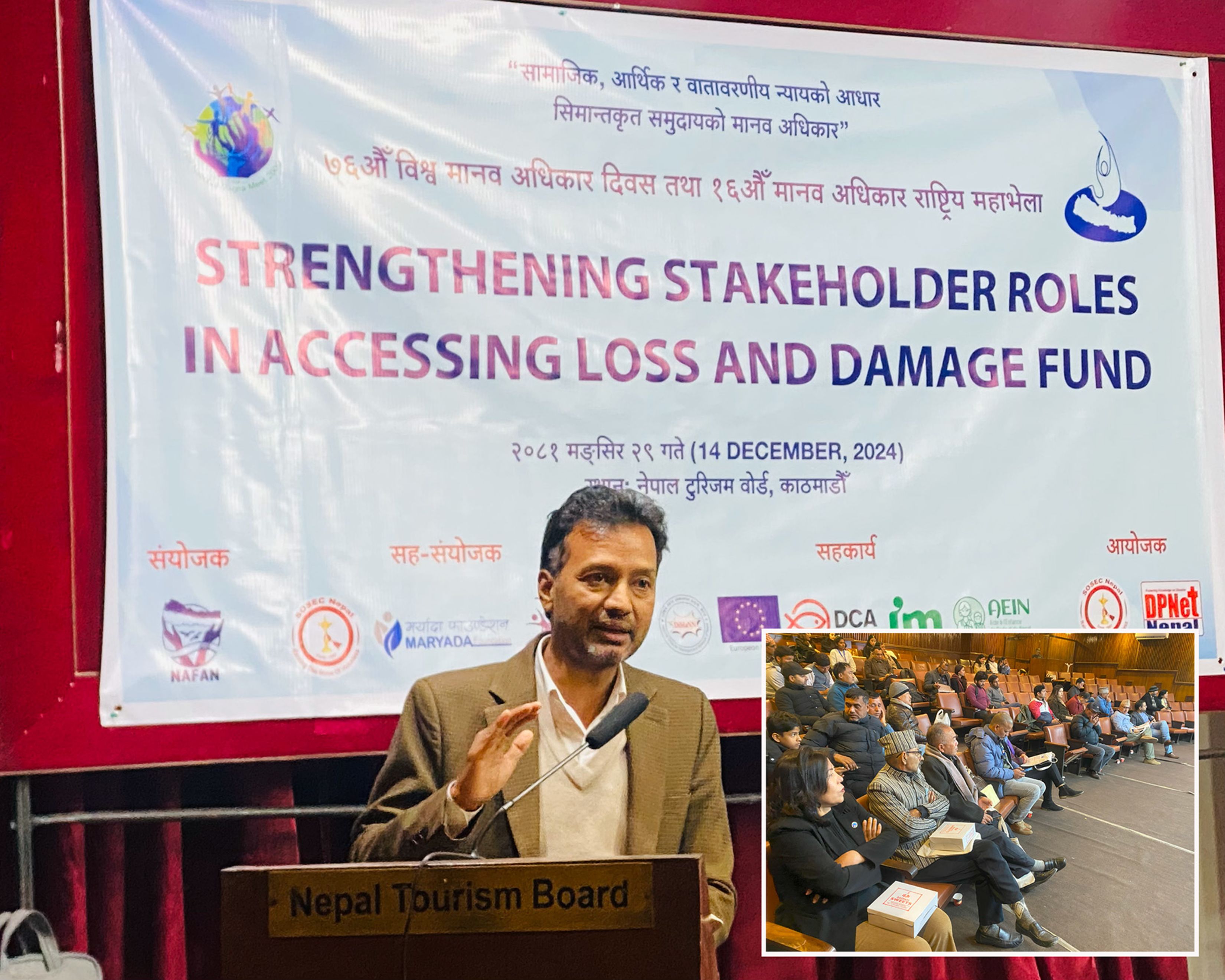 Kathmandu, December 14, 2024 – Marking the 76th International Human Rights Day, a national dialogue program titled "Strengthening Stakeholder Roles in Accessing Loss and Damage Fund" was organized at the Nepal Tourism Board, Kathmandu. Hosted by DPNet Nepal in collaboration with SOSEC Nepal and supported by multiple national and international organizations including DCA, DiMaNN, the event aimed to integrate social, economic, and environmental considerations into safeguarding the rights of marginalized communities impacted by climate change.