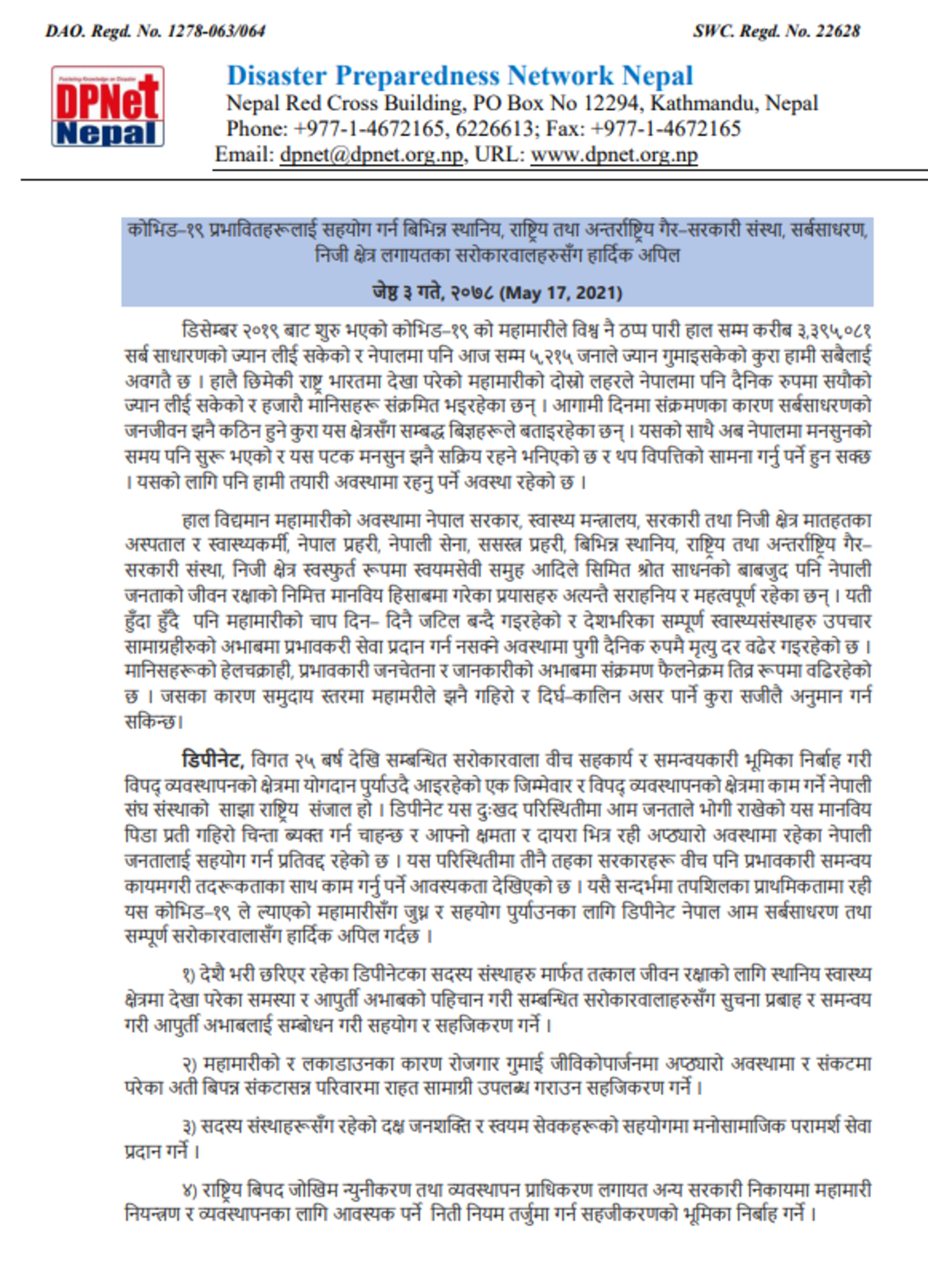कोभिड–१९ प्रभावितहरूलाई सहयोग गर्न सर्बसाधरण, निजी क्षेत्र लगायतका सरोकारवालहरुसँग हार्दिक अपिल