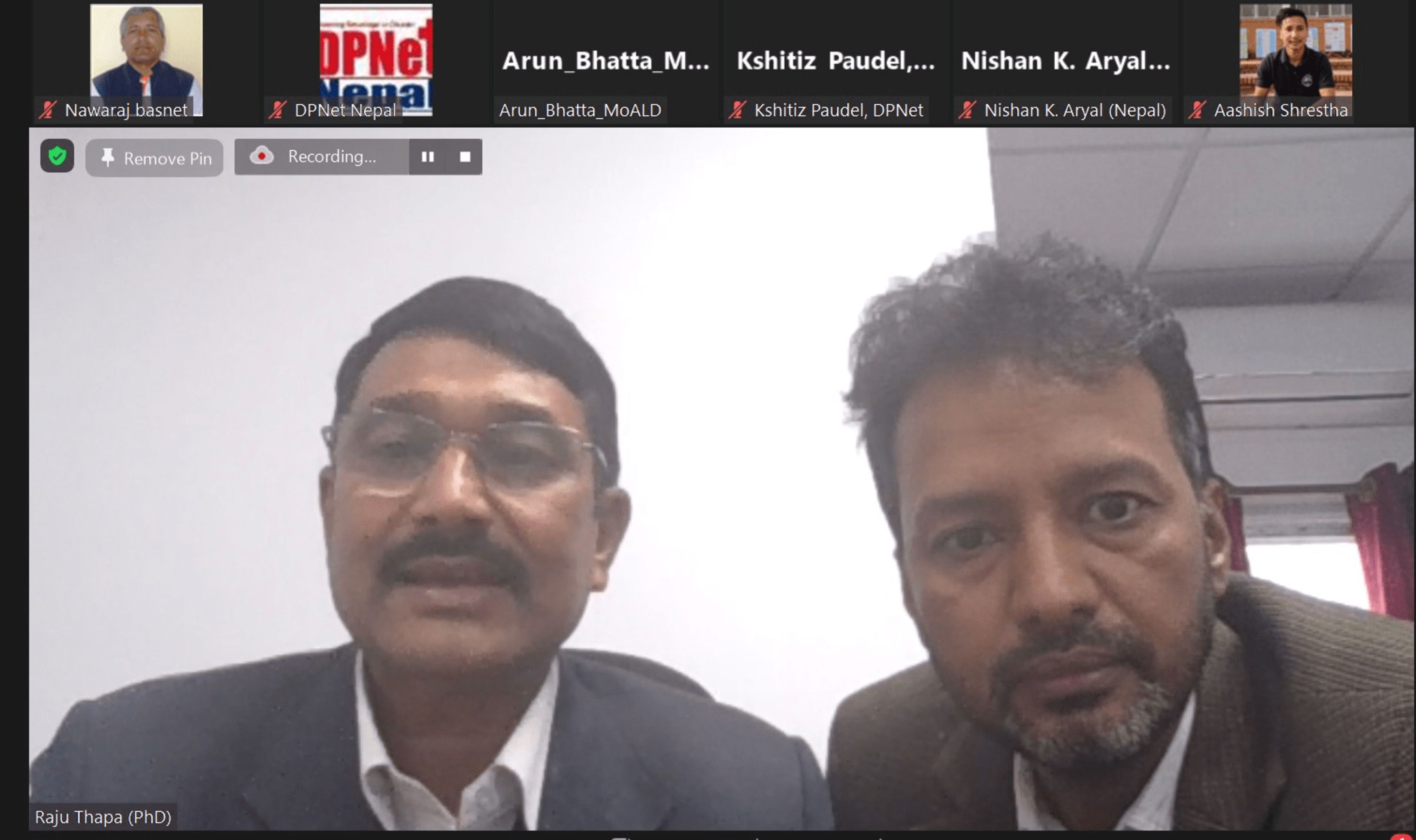 On October 30, 2023, DPNet Nepal organized a Discussion on Enhancing Agriculture and Livestock Resilience post-Bajhang Earthquake in collaboration with the Ministry of Agriculture and Livestock Development (MoALD) and the Food and Agriculture Organization (FAO). The event aimed to plan and coordinate agriculture and livestock impact assessments, focusing on the needs of affected households. Key figures present at the discussion included Mr. Dhruba Bahadur Khadka, Under Secretary/ Spokesperson/Information Officer of National Disaster Risk Reduction and Management Authority (NDRRMA), Dr. Arun Prakash Bhatta, Under Secretary at MoALD, Dr. Raju Thapa, Acting Chair of DPNet Nepal, Mr. Nawaraj Basnet, Chairperson of National Farmers Group Federation Nepal (NFGF), and Mr. Thakur P. Chauhan, Project Coordinator of FAO, among others from MoALD, DPNet, and FAO.