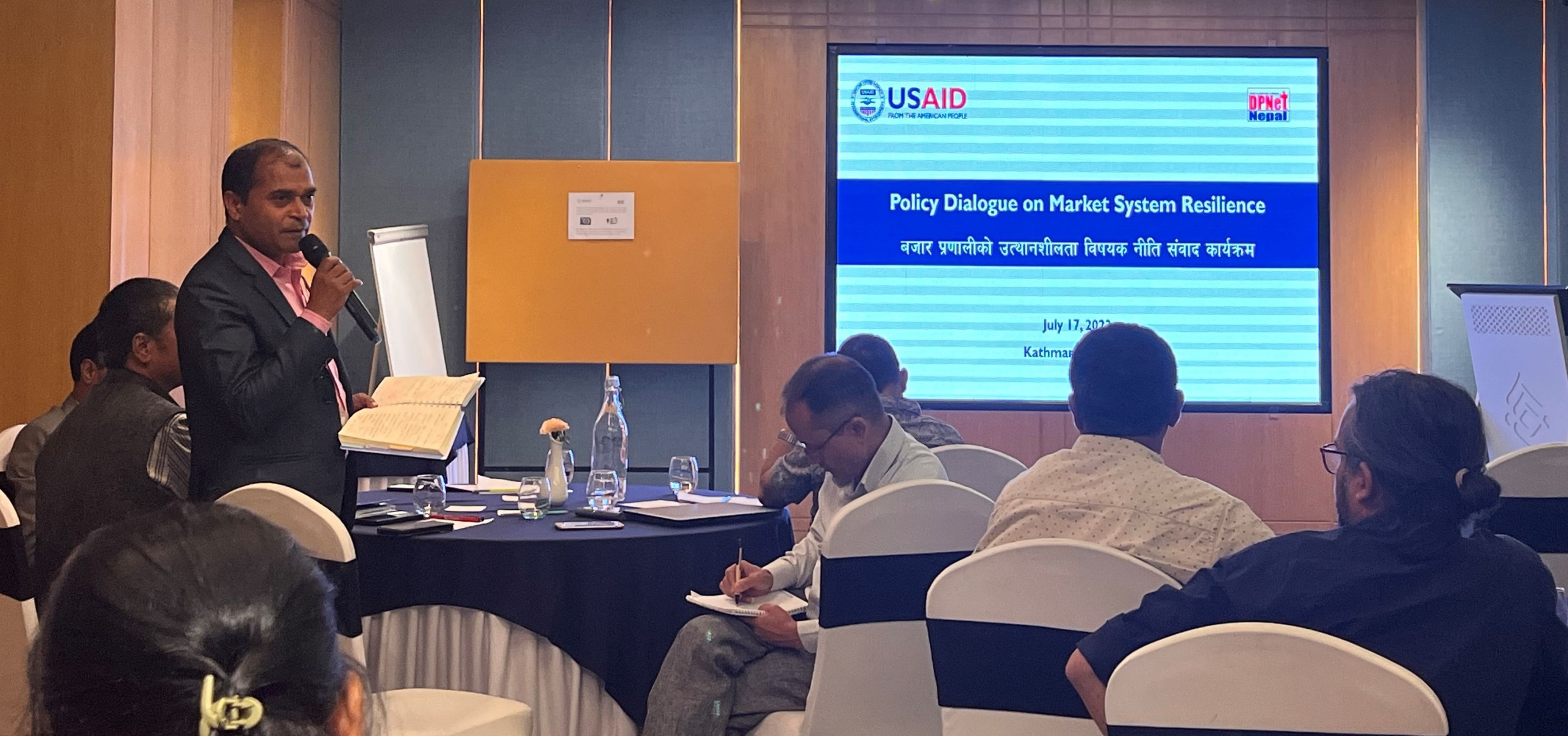 DPNet Nepal, in collaboration with USAID’s Tayar Nepal, conducted a Policy Dialogue for Market System Resilience on July 17, 2023. The event aimed to catalyze collaboration, coordination, and partnerships to improve the resilience of market systems in Nepal. The program witnessed representatives from the National Disaster Risk Reduction and Management Authority (NDRRMA), Ministry of Industry, Commerce and Supplies(MoICS), World Food Programme (WFP), Federation of Nepalese Chambers of Commerce and Industry (FNCCI), government agencies, development partner, private sector, DRR experts, security sector.