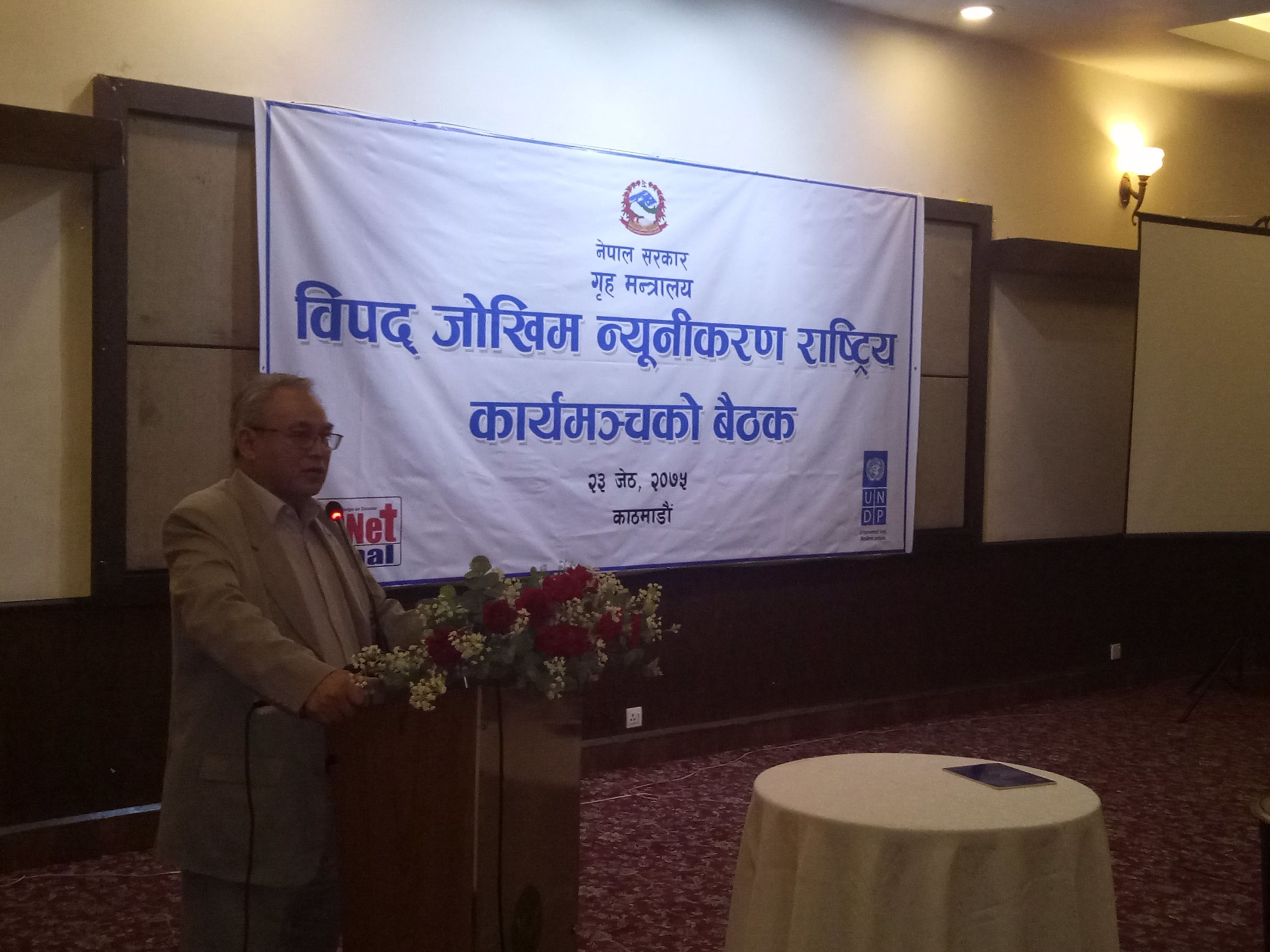 Meeting on National Platform for DRR (NPDRR) was organized by MoHA in coordination with DPNet-Nepal and UNDP on 6 th June 2018. The program was chaired by Secretary of Ministry of Home Affairs Mr. Prem Kumar Rai on the presence of Hon. Home Minister Ram Bahadur Thapa "Badal". The national disaster report (NDR)-2017 was launched in the program.