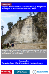 This is a research report on the Impacts assessment and climate change adaptation: Strategies in Makawanpur District, Nepal. The report discloses the climate change impacts developing countries, hindering their efforts in poverty reduction and sustainable development. These changes result in increased climate risks, such as more severe extremes and erratic rainfall, affecting livelihoods, assets, infrastructure, and economic growth. Nepal is particularly vulnerable, with diverse impacts observed from the Himalayas to the lowland plains. The study examines these impacts, especially drought and desertification, which harm agriculture and food security. It also notes increasing flooding trends. Local communities are implementing adaptation strategies and tree planting to combat climate change. Capacity building and knowledge transfer are crucial for managing current and future climate risks and integrating climate risk management into development plans.