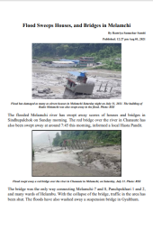 This newspaper article provides details on the Melamchi flood that swept houses and bridges along with many other devastations. The flood has disrupted daily life for the affected communities, cutting off access to essential services like food, clean water, and communication. Rescue and relief efforts are underway, with the Nepalese authorities and relief organizations mobilizing to provide assistance to the affected residents. This incident highlights the vulnerability of regions like Melamchi to the monsoon season’s destructive forces and the urgent need for support and rehabilitation for those who have been left homeless and in need.