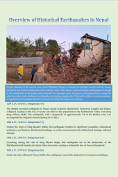 Nepal, situated in the central part of the Himalayan Range, contends with heightened seismic activity owing to its location in one of the world's most active seismic zones. The recurrent earthquakes stem from the subduction of the Indian plate beneath the Eurasian plate, generating converging forces along the plate boundary and resulting in earthquakes of varying magnitudes. Spanning centuries, the historical earthquakes in Nepal have left an indelible mark on the region. From the earliest recorded earthquake in 1255 A.D., a devastating event that claimed nearly one-third of the population in the Kathmandu Valley, to the Great Nepal-Bihar earthquake of 1934 that caused widespread destruction and loss of life, these seismic events underscore Nepal's vulnerability to such natural disasters. The enduring impact on structures, cultural heritage, and, most importantly, the lives of its people highlights the need for ongoing efforts to mitigate the consequences of seismic activity in this geologically dynamic region.