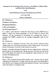 This is an official statement by Statement by Mr. Prem Kumar Rai, Secretary at the Ministry of Home Affairs and Head of the Nepali Delegation to the Global Platform for Disaster Risk Reduction (GP 2019).