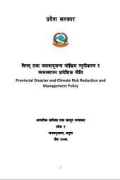 The "Provincial Disaster and Climate Risk Reduction and Management Policy" report by the Ministry of Home Affairs and Law, Madesh Province, examines the current disaster and climate risk landscape and proposes a strategic framework for managing these risks. It also incorporates a background and specific risk analyses of hazards like floods, droughts, fires, and cold waves. The report outlines a long-term vision, goals, objectives, and policies, emphasizing resilience through detailed strategies and conceptual approaches. It focuses on policy implementation, coordination, monitoring, evaluation, and periodic review to ensure adaptability to new challenges. This comprehensive framework aims to build resilience, reduce vulnerabilities, and enhance the province's capacity to effectively manage disaster and climate risks.