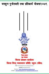 The "Monsoon Preparedness and Response Plan 2079" for West Rukum provides a comprehensive framework to manage monsoon-related risks. It begins with a background on the necessity of such a plan and outlines its purpose to mitigate the impact of monsoon hazards. The document covers the overall situation of the district, detailing its climate, land, and land use conditions. It includes demographic data by municipality and rural municipality, identifies flood and landslide-prone areas, and assesses available institutional resources. Contact details for member organizations, District Coordination Committee officials, municipal and village representatives, and Zilla Kawda Presidents were provided. The plan also lists available ambulances, private health institutions, and contact numbers for various district offices. Additionally, it outlines specific pre-monsoon preparedness measures to ensure safety and resilience during the monsoon season.