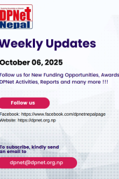 DPNet Nepal’s Weekly Update of 6th October, 2025 highlights key global and national opportunities in climate change, disaster risk reduction, and sustainable development. Featured conferences and trainings include EUCELS, ICONSE-25, ICSWAEEE 2026, ICEP 2026, ICCCH 2026, Smithsonian Fellowship 2025–27, UKRI Future Leaders, Russell E. Train and ICON Fellowships, training for mechanics on electric mini/microbuses, a South Asia field course on vulnerability assessment, and a program on sustainable water management. Scholarship opportunities include the DAAD MSc in Environmental Risks, Saudi Government Scholarships 2026, WATENV, Renewable Energy MSc, IsDB, Yenching Academy, Commonwealth, Oxford Pershing Square, Oxford Clarendon, NTU Taiwan, Ireland Government, Murdoch RTP, Pokhara University FST Masters, Landscape Ecology, TropHEE, and MEG Programme. Awards and grants feature the Earth Prize, House of No Waste, Yves Rocher Terre de Femmes, Purpose Earth Grant, World Sustainability Award 2026, Rising Explorer, Pure Earth Opportunity Fund, GEF Small Grants Programme, Wildlife Acoustics, DRK Foundation, and the Environmental Photography Award 2025. Vacancy and funding calls include German Embassy Nepal Small-Scale Project Funding 2026, ACCTIF Carbon Associate at GGGI, RFPs for climate-resilient agriculture, Disaster Law Consultant (Nepal), agroforestry engagement, Climate Smart Agriculture Project evaluation, and Japan’s 2026 paid internship. Recent news covers DPNet’s dialogues on heat and fire risk, unified preparedness with NPDRR, and monsoon readiness during Dashain.