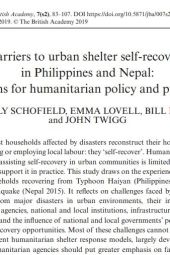 This study draws on the experiences and perspectives of households recovering from Typhoon Haiyan (Philippines 2013) and the Gorkha Earthquake (Nepal 2015). It reflects on challenges faced by households to self-recover from major disasters in urban environments, their interactions with humanitarian agencies, national and local institutions, infrastructures, markets, and communities, and the influence of national and local government policies and practices on self-recovery opportunities. Most of these challenges cannot be addressed by adopting current humanitarian shelter response models, largely developed for rural contexts. Humanitarian agencies should put greater emphasis on facilitation rather than implementation, and respond more flexibly to the complexity of post-disaster urban contexts.