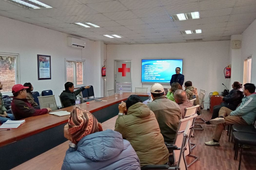 DPNet Nepal, in collaboration with the Nepal Red Cross Society, organized an awareness and technical discussion session on Nipah Virus (NiV) at the Red Cross Periphery. The session was facilitated by Dr. Hemanta Chandra Ojha from the Ministry of Health and Population, Government of Nepal, focusing on emerging risks, transmission pathways, and preparedness measures related to the deadly zoonotic disease.