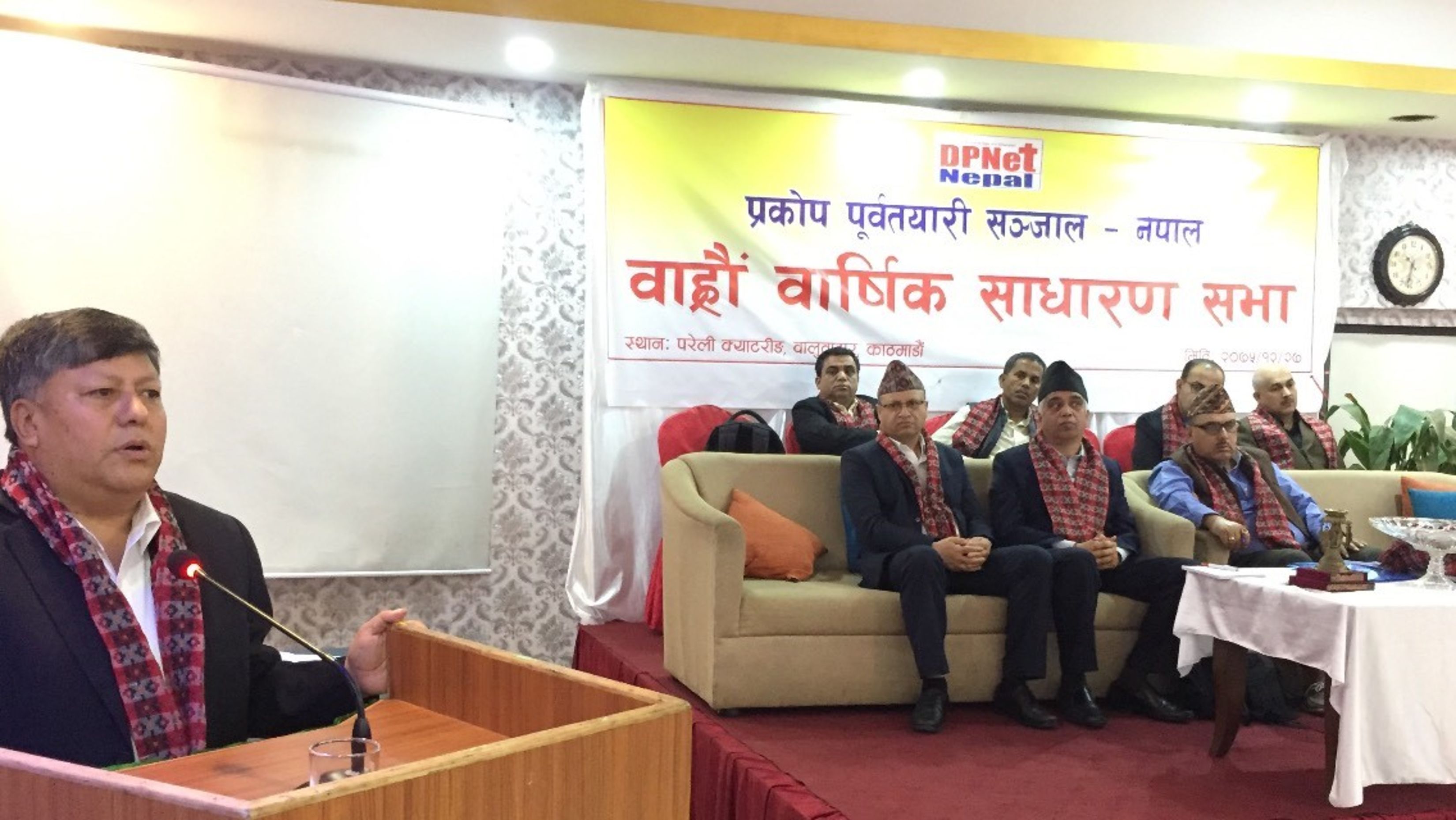 In the opening session of the AGM, Mr. Jagannath Prasad Kurmi, chairperson, NCDMC, Ms. Kanchan Shrestha, Program Coordinator, ICIMOD, Mr. Santosh Dahal co-coordinator, AINTGDM, Mr. Bishnu Prasad Timilsina, General Secretary, DiMaNN, Mr.Balkrishna Pokharel representative, Nepal Chamber of Commerce, Dr. Meen Bahadur Poudel Chhetri, former chairperson, DPNet-Nepal, Mr. Devratna Dhakwa, General Secretary, NRCS, Mr. Dillu Prasad Ghimire, representative NGO Federation of Nepal, Mr. Rishi Raj Acharya, Under Secretary, MoFAGA, Mr. Bamshi Acharya, Under Secretary, MOHA and chief guest Dr. Gangalal Tuladhar delivered their remarks. The opening session was closed with the remarks Chairperson of DPNet-Nepal. He thanked all for their active participation in the program.
