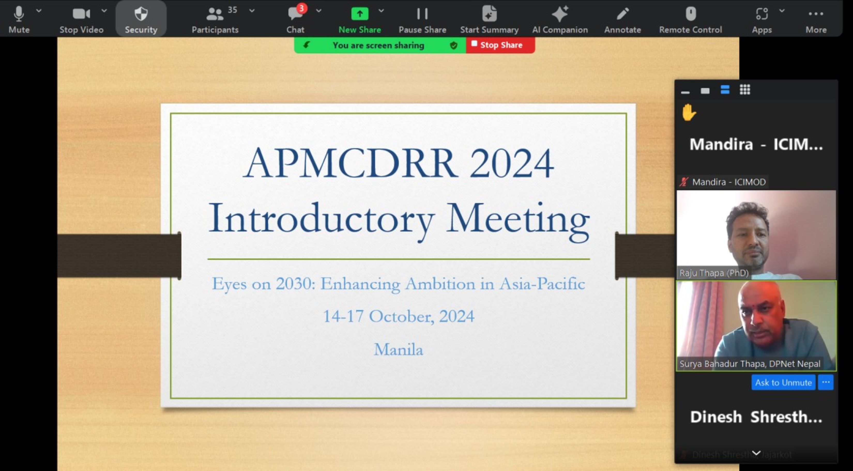 On February 28, 2024, DPNet hosted a virtual discussion program in preparation for the Asia-Pacific Ministerial Conference on Disaster Risk Reduction (APMCDRR), 2024, using the Zoom platform. This online gathering, chaired by DPNet Chair, Surya Bahadur Thapa, and with the contextual matter of APMCDRR Preparations set by Vice Chair Dr. Raju Thapa, drew participation from 40 attendees. The purpose of this gathering was to begin early preparations for the future APMCDRR-2024 program, which will take place in the Philippines from October 14–17, Manila.