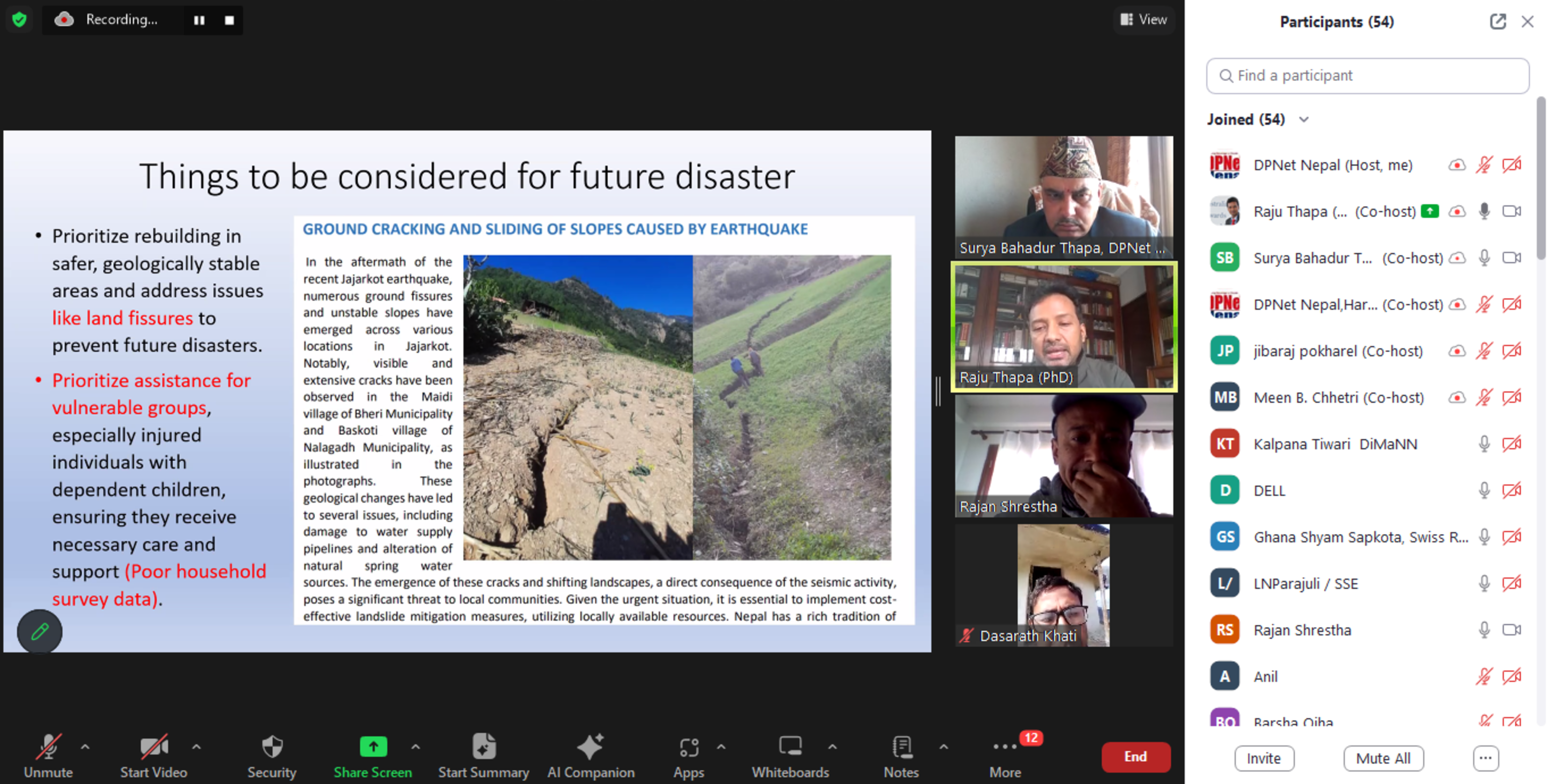 In a virtual event held on 19th February 2024 in support of UN FAO, the DPNet shared the aftermath and recovery efforts following the devastating Jajarkot earthquake. This online gathering, chaired by DPNet Chair, Surya Bahadur Thapa, and with the contextual stage set by Vice Chair Dr. Raju Thapa, drew participation from 64 attendees, highlighting the urgency and importance of post disaster review in the wake of recent Jajarkot earthquake.
