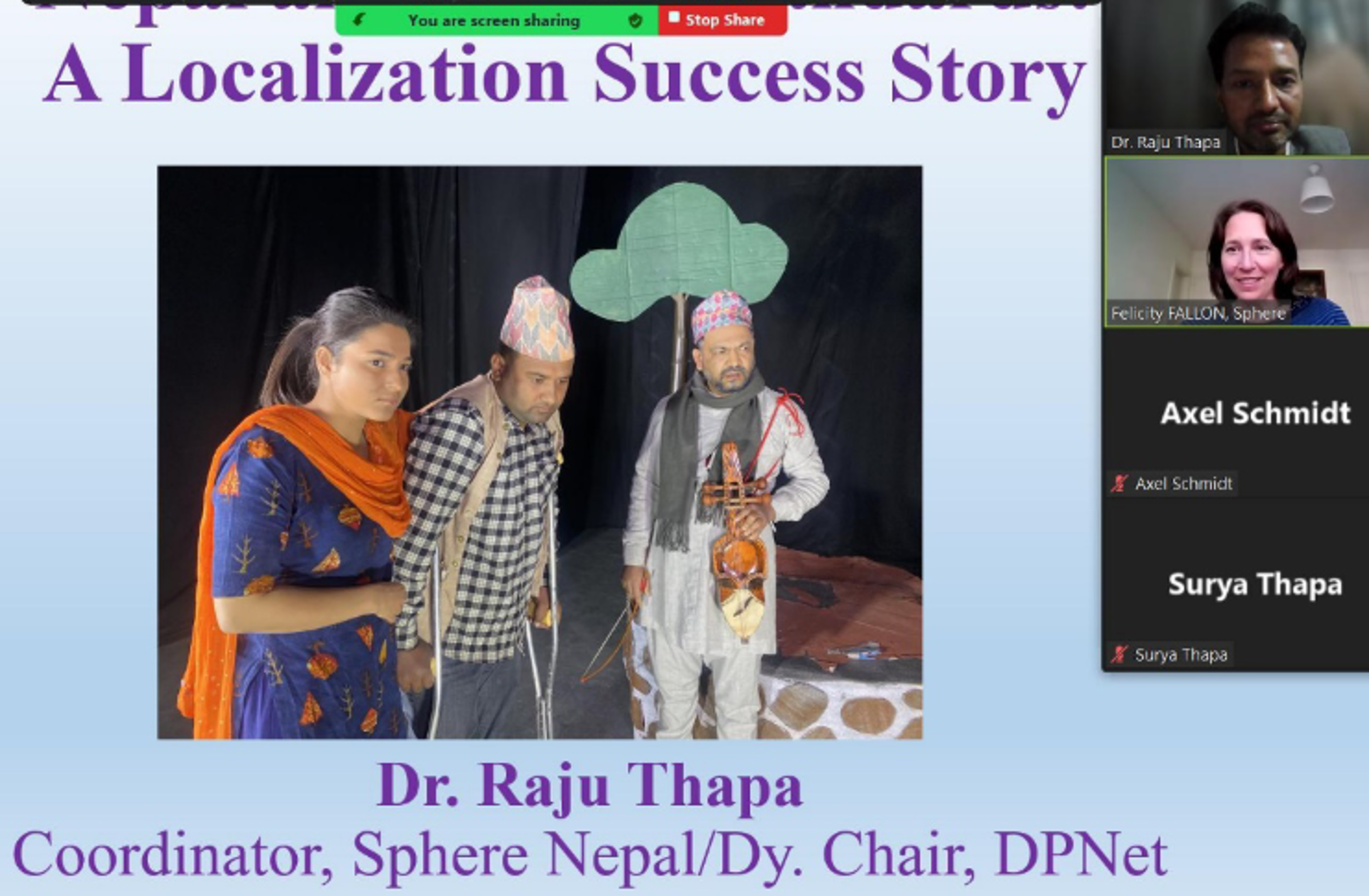 April 18, 2023, During the online Humanitarian Networks and Partnerships Week (HNPW), Dr. Raju Thapa, Vice Chair and Coordinator of Sphere Nepal, shared the country's success in localizing and implementing Sphere Standards. Sphere Geneva supported the event, with Felicity Fallon highlighting the session's objectives.