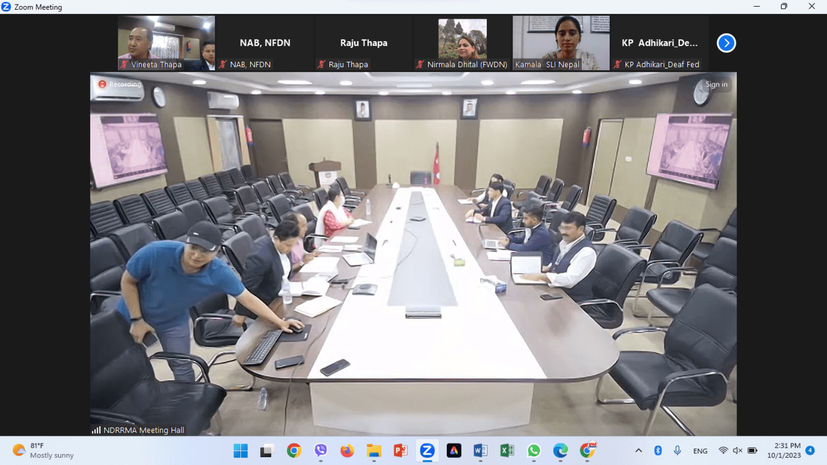 On October 1, 2023, a preparatory meeting was held for International Day for Disaster Risk Reduction 2023 in Nepal, with a focus on People with Disabilities (PWD). The meeting took place at the NDRRMA Hall in Singhadurbar and was organized under the banner of the National Platform for Disaster Risk Reduction (NPDRR), coordinated with DPNet.