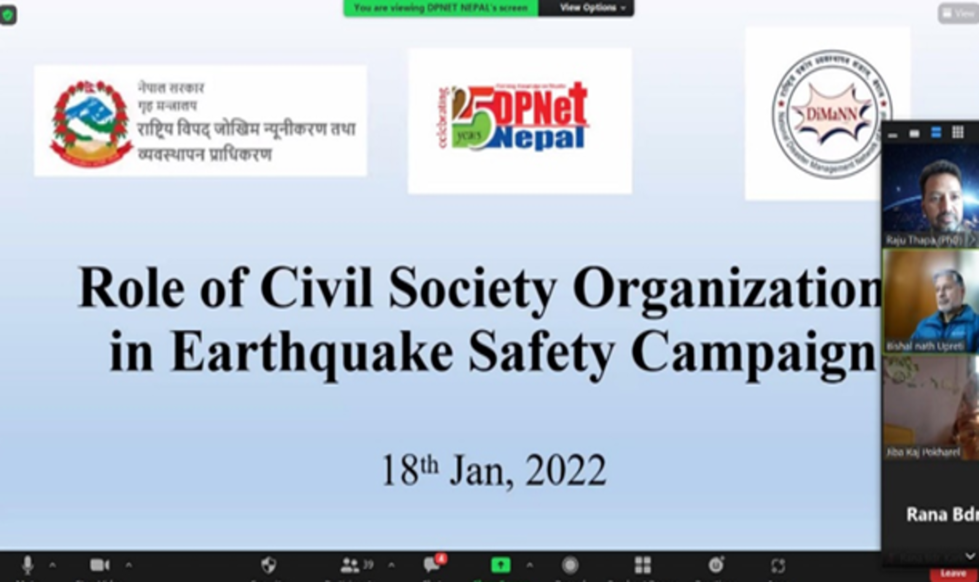 The Role of Civil Society Organizations (CSOs) in Earthquake Safety Campaign was jointly organized by Disaster Preparedness Network (DPNet-Nepal) and National Disaster Management Network Nepal (DiMaNN) on 18th January 2022 virtually. Dr. Raju Thapa, Vice Chairperson, DPNet facilitated the program. Opening the virtual discussion Dr. Raju Thapa shared about the civil society organizations which have been actively working in the field of disaster. He said that documentation in the field of disaster is lacking. Mr. Kailash Rijal, General Secretary of DPNet welcomed all the participants and highlighted about mitigating the earthquake risk and its impotence in a seismically vulnerable country like Nepal. Since Nepal lies in earthquake hazard zone, it is important to have preparedness for reducing the risk. The CSO role should extend to inform the people about the disaster risk and inform them about the government’s guideline. All together 75 participants joined the webinar.