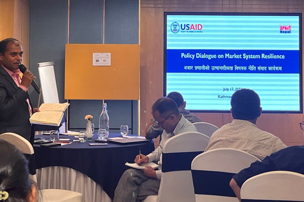 DPNet Nepal, in collaboration with USAID’s Tayar Nepal, conducted a Policy Dialogue for Market System Resilience on July 17, 2023. The event aimed to catalyze collaboration, coordination, and partnerships to improve the resilience of market systems in Nepal. The program witnessed representatives from the National Disaster Risk Reduction and Management Authority (NDRRMA), Ministry of Industry, Commerce and Supplies(MoICS), World Food Programme (WFP), Federation of Nepalese Chambers of Commerce and Industry (FNCCI), government agencies, development partner, private sector, DRR experts, security sector.