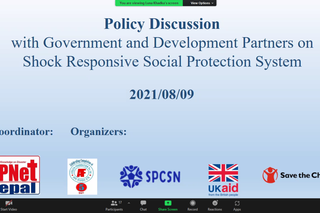 The virtual discussion program entitled “Policy Discussion with Government and Development Partners on Shock Responsive Social Protection System (SRSP)” was coordinated by DPNet-Nepal, organized by Atullya Foundation, SPCSN, and supported by Save the Children and UKaid on 9th August, 2021.