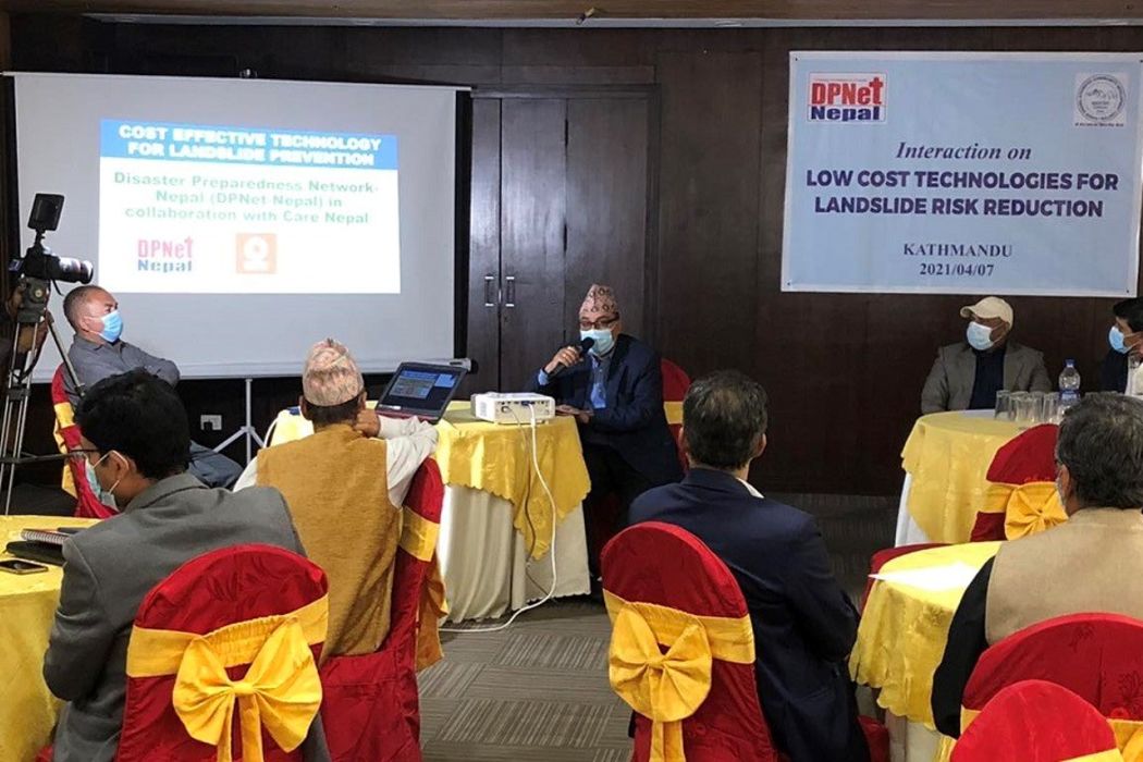 The interaction titled "Affordable Technologies for Landslide Risk Reduction" was jointly organized by Disaster Preparedness Network-Nepal (DPNet), Shree Swanra Integrated Community Development Center (SSICDC), and Care Nepal on 7th April 2021 at Indreni Foodland, Kathmandu. The program was chaired by Mr. Surya Bahadur Thapa, Chairperson of DPNet, and Dr. Raju Thapa, General Secretary of DPNet, welcomed the attendees and highlighted the program's objectives.