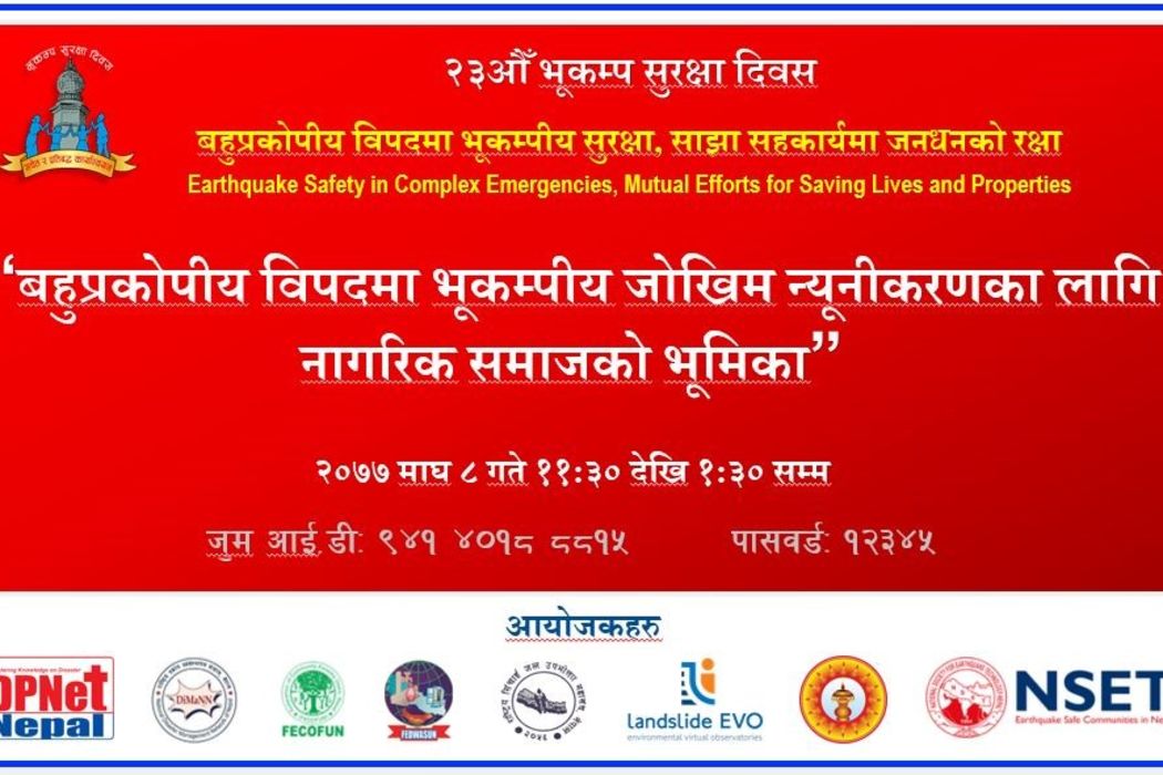 The joint organization of DPNet-Nepal, DiMaNN, FECOFUN, FEDWASUN, NFIWUAN, Practical Action Consulting, and NSET held a webinar on January 21, 2021, titled "The Role of Civil Society Organizations in Ensuring Earthquake Safety during Complex Emergencies." The program was part of the nationwide events organized throughout the country to commemorate the 23rd Earthquake Safety Day.