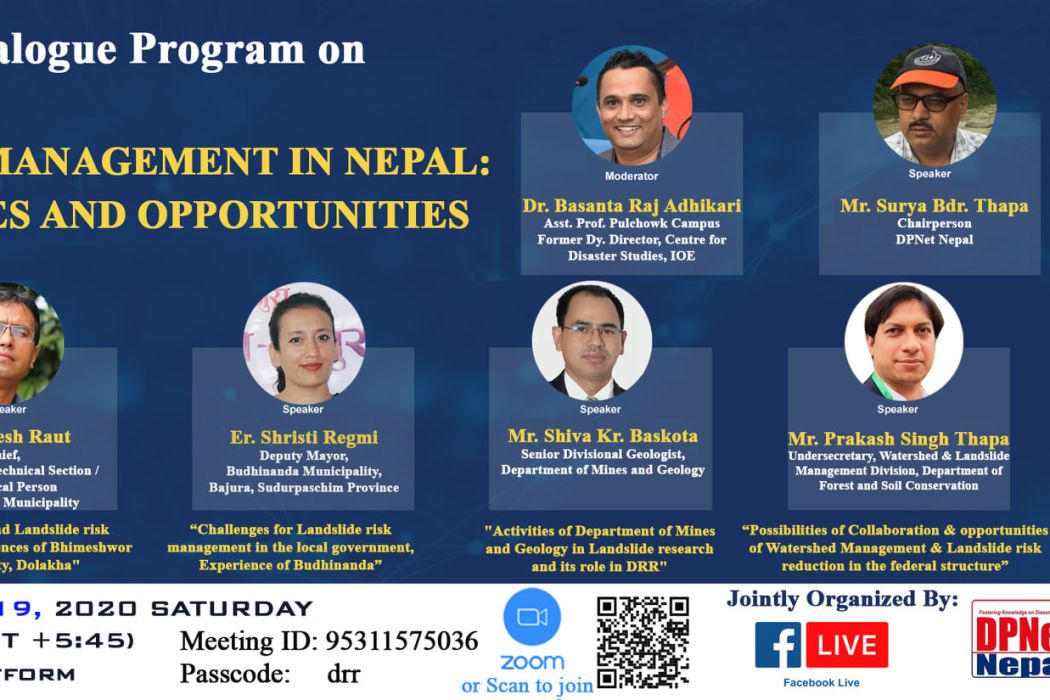 The joint organization of the Policy Dialogue program on Landslide Management in Nepal: Challenges and Opportunities involved DPNet-Nepal, Institute of Himalaya Risk Reduction, Nepal Engineer's Association, and Bagmati Province on December 19, 2020. The program was chaired by Er. Nanda Lal Banjade, the President of Nepal Engineer's Association, and attended by Dr. Ganga Lal Tuladhar, a former Education Minister and DRR&M expert, as the chief guest. Additionally, Mr. Surya Bahadur Thapa, Chairperson of DPNet-Nepal, and Prof Dr. Tri Ratna Bajracharya, President of Nepal Engineers' Association, participated as special guests.