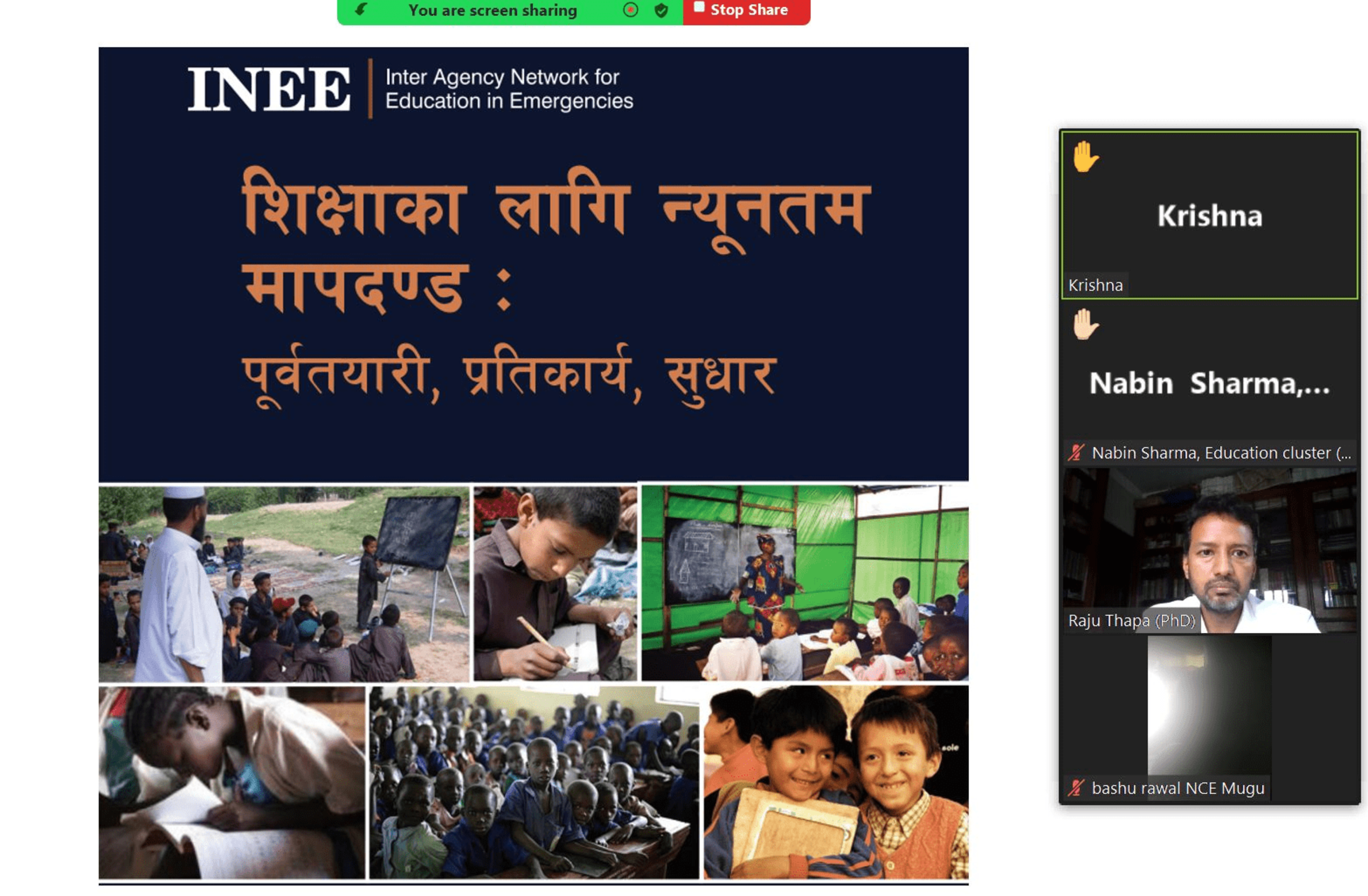 DPNet Nepal organized a virtual discussion session on "Minimum Standards for Education: Preparedness, Response, Recovery" on October 4, 2023, via an online platform. Serving as the Focal Point for the Sphere Standard in Nepal, DPNet collaborated with the National Campaign for Education (NCE) and Save the Children to organize this virtual discussion program focusing on Minimum Standards for Education in Nepal.