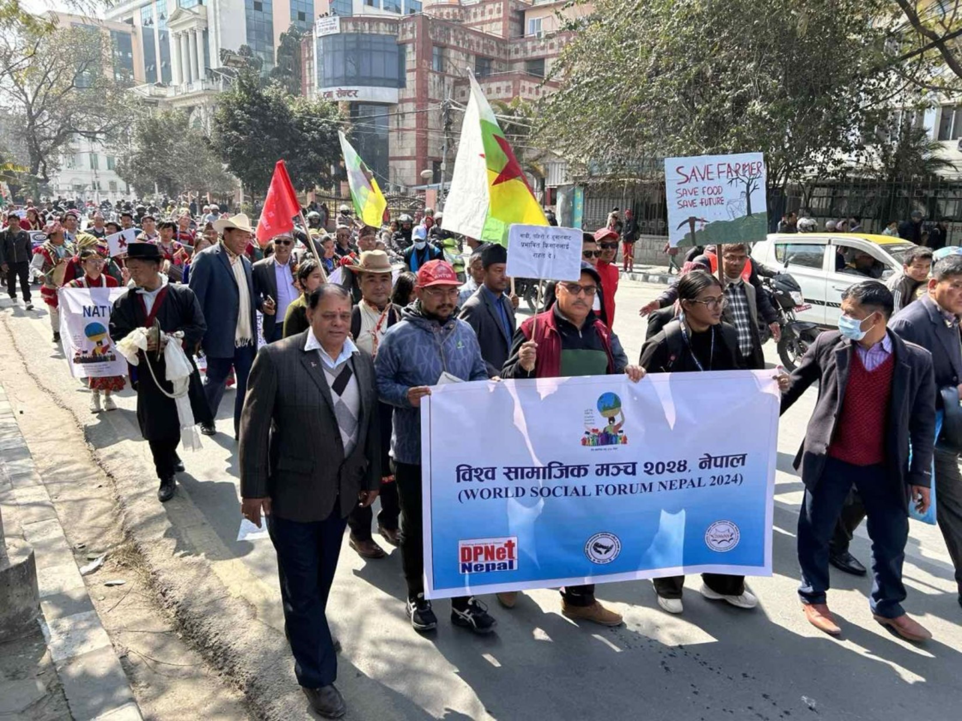DPNet Nepal along with Disaster Management Network (DiMaNN) and the National Network of Community Disaster Management Committee (NCDMC) marched in a rally at the World Social Forum. The team of DPNet in the rally was led by Mr. Surya Bahadur Thapa, DPNet chairperson. Dr. Raju Thapa, Vice-chair, along with Mr. Harshaman Maharjan, Deputy General Secretary from DPNet also participated in the opening session. DPNet's participation in the rally was part of its commitment and solidarity, emphasizing the belief that another world is possible. It aimed to actively engage in a global platform that promotes social justice, equality, and the possibility of a better world.