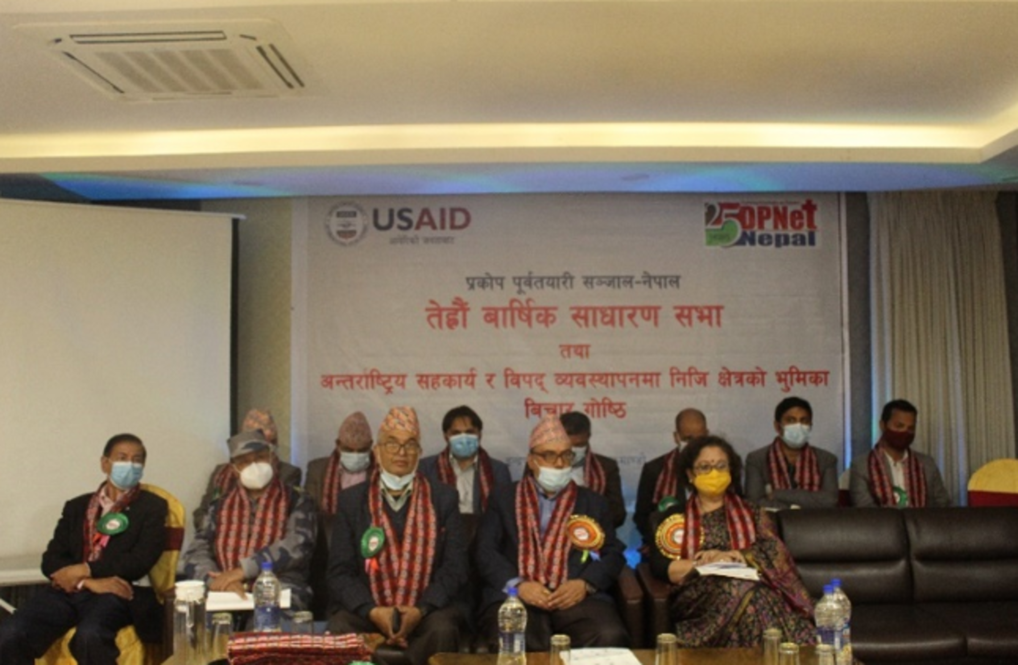 The interaction program on the Role of the Private Sector in International Coordination and Disaster Management was organized by DPNet under USAID/Tayar’s Chhemata Avibridhhi (Capacity enhancement for DRR&M) on 12th Nov, 2021 on Indreni Foodland, Kathmandu. The program was organized on the occasion of the 13th annual general assembly of DPNet-Nepal. The Chief Guest of the program was Honorable Saloni Pradhan Singh, Member of National Planning Commission (NPC). The program was chaired by Mr. Surya Bahadur Thapa, Chairperson of DPNet. The welcome speech was given by Mr. Ram Prasad Bhattarai, Vice Chairperson of DPNet. The guests of the program were representative’s form NDRRMA, MoFAGA, Armed Police Force Nepal, Nepal Police Advisory Board of DPNet, AIN, SWC, USAID/Tayar, NRCS, FNCCI, and UNRCO. Altogether, 79 participants participated in the program.