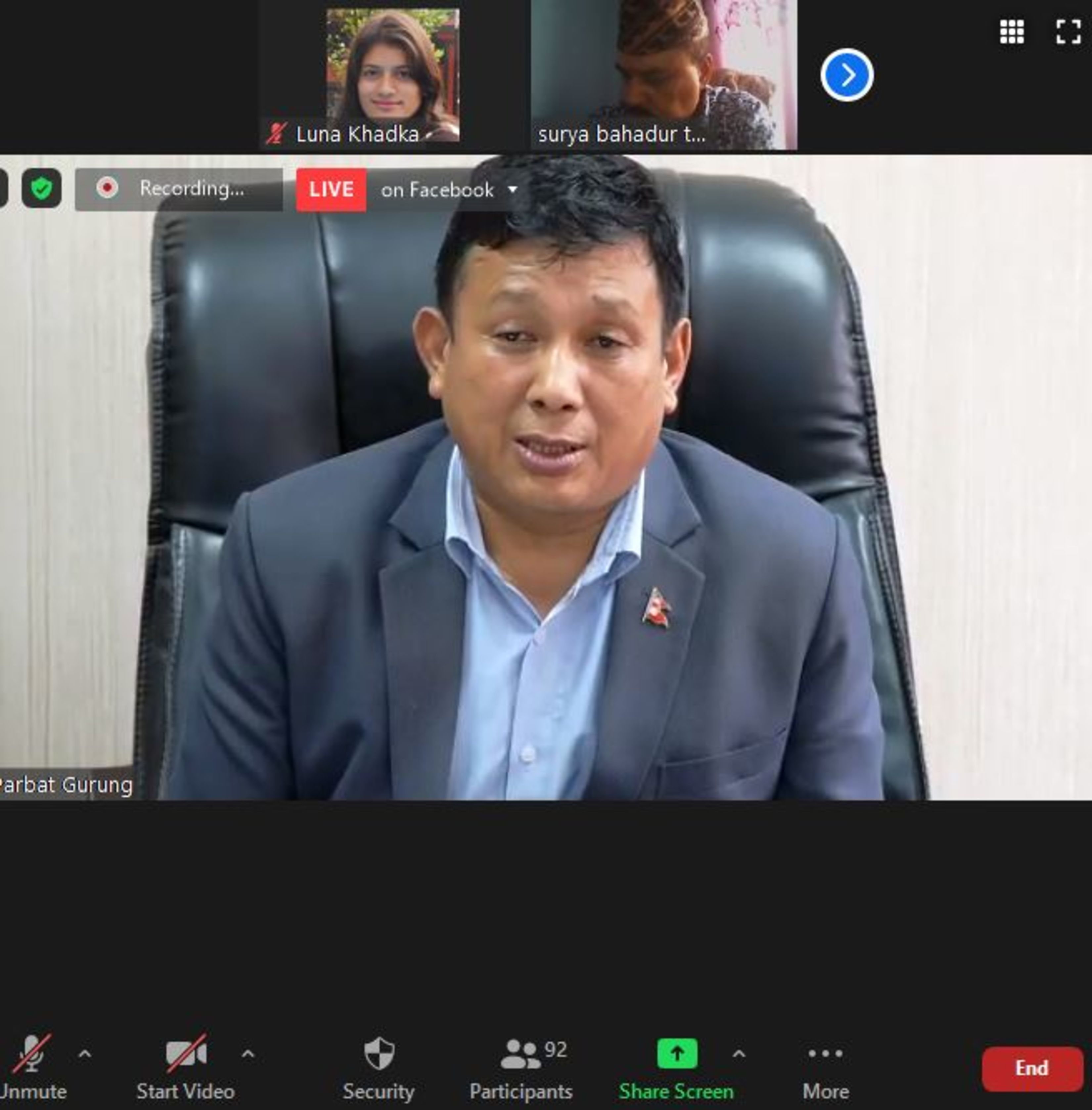 September 23, 2020- A virtual program titled "Roles of Civil Society Organizations in Disaster Risk Reduction and Management" was successfully organized on September 23, 2020, by DPNet-Nepal, DiMaNN, and NGO Federation. The event took place on the occasion of the 41st Social Service Day and was chaired by Mr. Surya Bahadur Thapa, Chairperson of DPNet-Nepal and DiMaNN. The Chief Guest for the event was Hon. Parbat Gurung, Minister for Women, Children, and Senior Citizens.