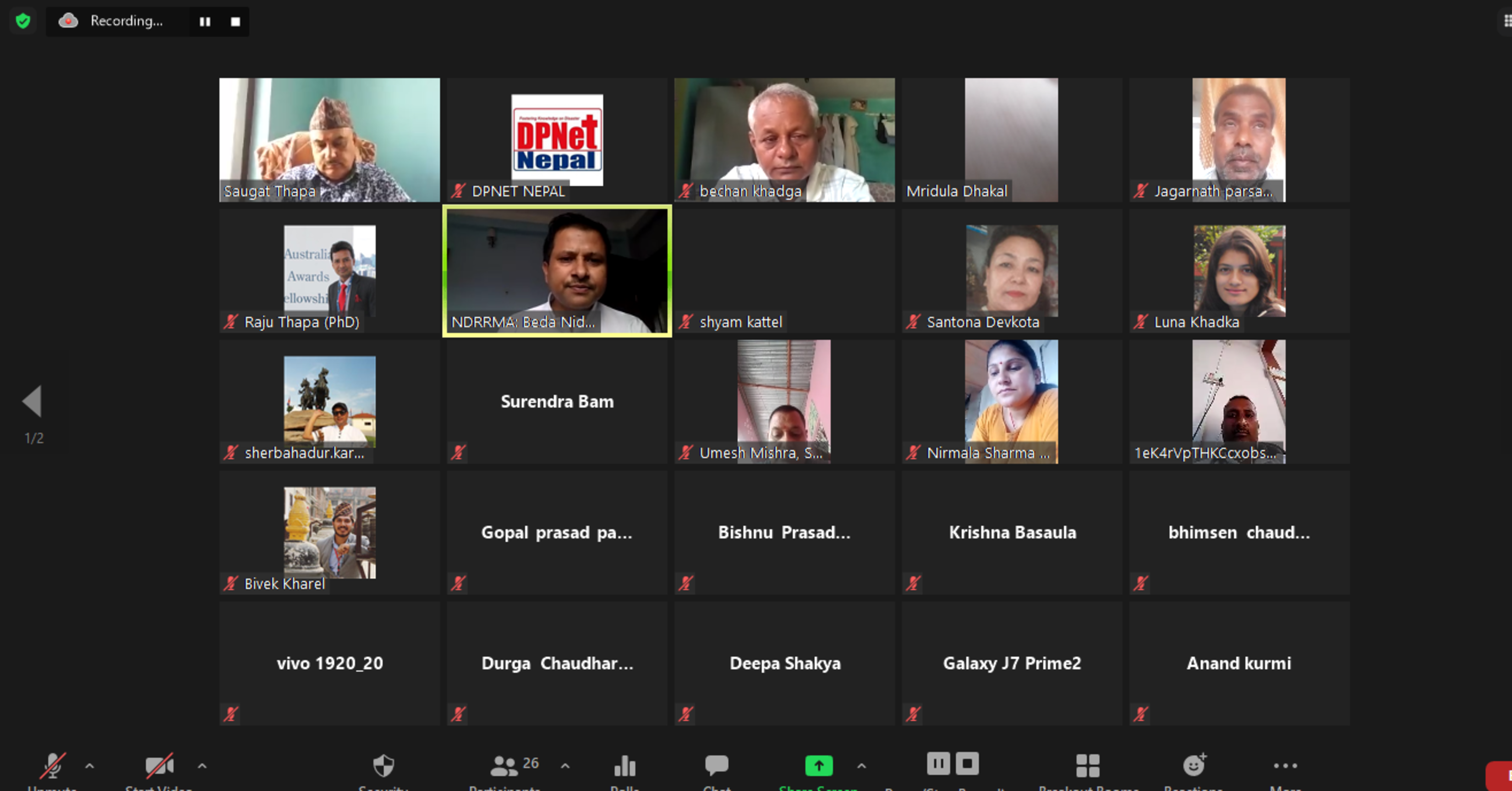 The Subjective Committee discussion program of Disaster Affected Committee Group under the National Platform for Disaster Risk Reduction (NPDRR) was organized by DPNet-Nepal under USAID/Tayar Nepal Capacity Enhancement for DRR&M project on 18th July, 2021. The program was chaired by Mr. Beda Nidhi Khanal, Under Secretary of National Disaster Risk Reduction and Management Authority (NDRRMA). Mr. Surya Bahadur Thapa, Chairperson of DPNet-Nepal delivered the opening remarks and highlighted the objective of program. He briefly shared about the NPDRR and the importance of disaster affected community has very important part in DRR&M and their group is included as one of the Subjective Committee the platform. He further stated that disaster affected community can contribute and provide information on how can we reduce the disaster risk and reduce the loss and damage. Altogether 22 participants joined the webinar.