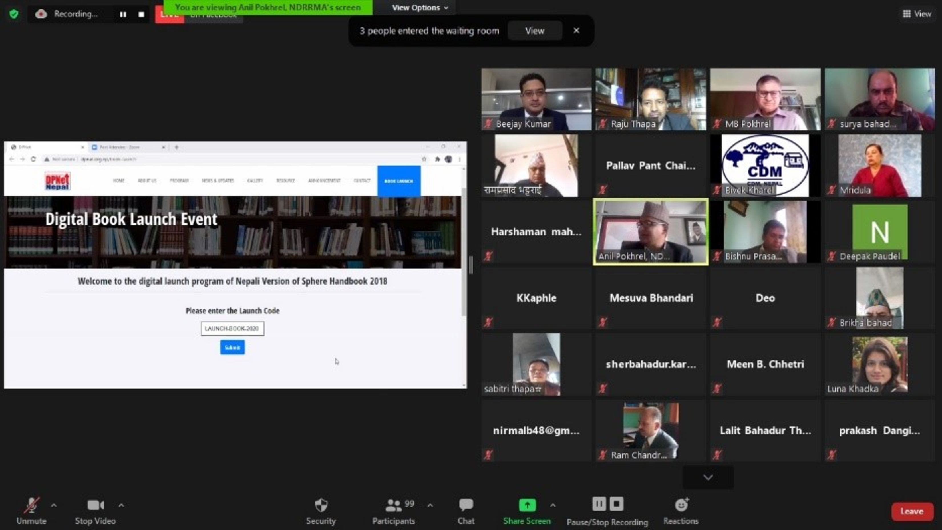 During the virtual launch ceremony, Mr. Anil Pokhrel performed the official unveiling of the Nepali translation of the Sphere Handbook. He commended DPNet for the diligent translation work and highlighted the pride of Nepal having the distribution rights of the Nepali version in Bhutan, Brunei, and Myanmar. Mr. Pokhrel emphasized the significance of the Sphere Standard, mentioning that the National Strategy for Disaster Risk Management 2009 was the first document by the Government of Nepal to recognize its importance. Considering Nepal's vulnerability to natural disasters, he stressed the critical role of the Sphere Standard in raising awareness and providing guidance for humanitarian assistance.