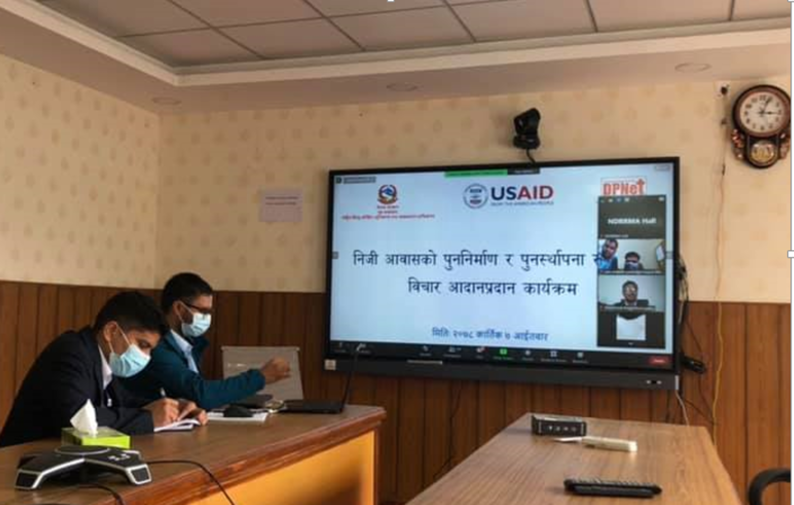 Periodic sharing meeting (in-person + virtual) entitled “Reconstruction and Rehabilitation of Private houses” was organized at NDRRMA hall by NDRRMA and supported by DPNet-Nepal under USAID/Tayar Nepal project. Mr. Anil Pokhrel, Chief Executive of NDRRMA chaired the program, whereas Mr. Surya Bahadur Thapa, Chairperson of DPNet-Nepal shared the welcome remarks and objectives of the program. He shared about the current loss due to the post monsoon disaster. He also shared about the need of recovery for the damage caused by the floods to the farmer. He appreciated the coordination by NDRRMA for this program and thanked everyone for participation and said that this program will provide way forward to effectively conduct reconstruction and rehabilitation. Altogether 231 people joined the event virtually whereas, 27 were present in person.