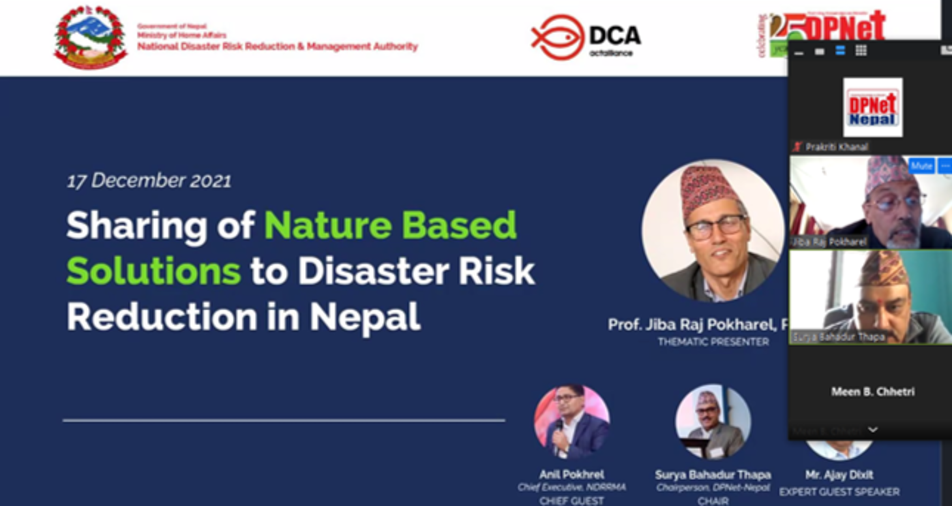 The virtual sharing of Nature Based Solutions to Disaster Risk Reduction in Nepal was organized by DPNet Nepal in coordination with National Disaster Risk Reduction and Management Authority (NDRRMA) and DCA on 17th December, 2021. Dr. Raju Thapa, Vice Chairperson of DPNet gave the welcome remarks and highlighted the objectives with focus on Nature Based Solutions to DRR. He further shared the success about low cost landslide mitigation technology carried in Siranchok Municipality of Gorkha District. He said that we can contribute in disaster management by using indigenous practices as well. He highlighted the importance of pond construction in disaster risk reduction and management. The program was chaired by Mr. Surya Bahadur Thapa, Chairperson of DPNet. Altogether 48 participants joined the webinar.