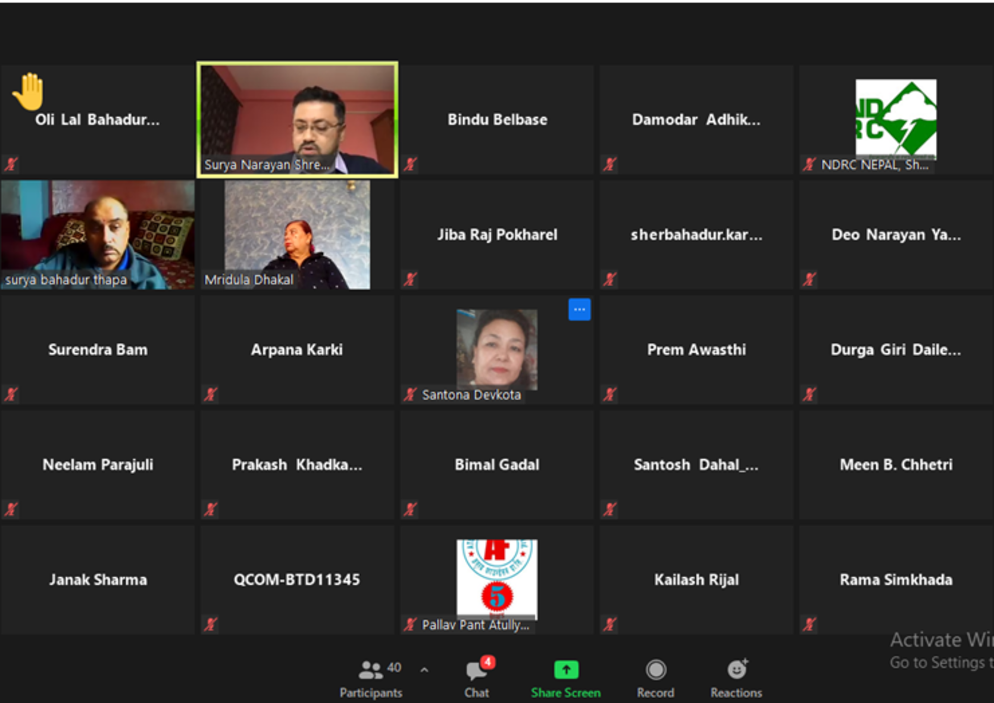 The virtual meeting was organized by Disaster Preparedness Network- Nepal (DPNet) between DPNet members, cluster co-leads, AINTGDM, Board Member, Advisory Committee and Technical Advisors on 12th May 2021 with the objective to discuss on coordination and joint effort for COVID 19 response. Altogether 41 participants joined the event. The program was initiated with welcome note from Chairperson Mr. Surya Bahadur Thapa. He also highlighted the objective of the meeting. He emphasized on the need of coordination and joint response on COVID 19.