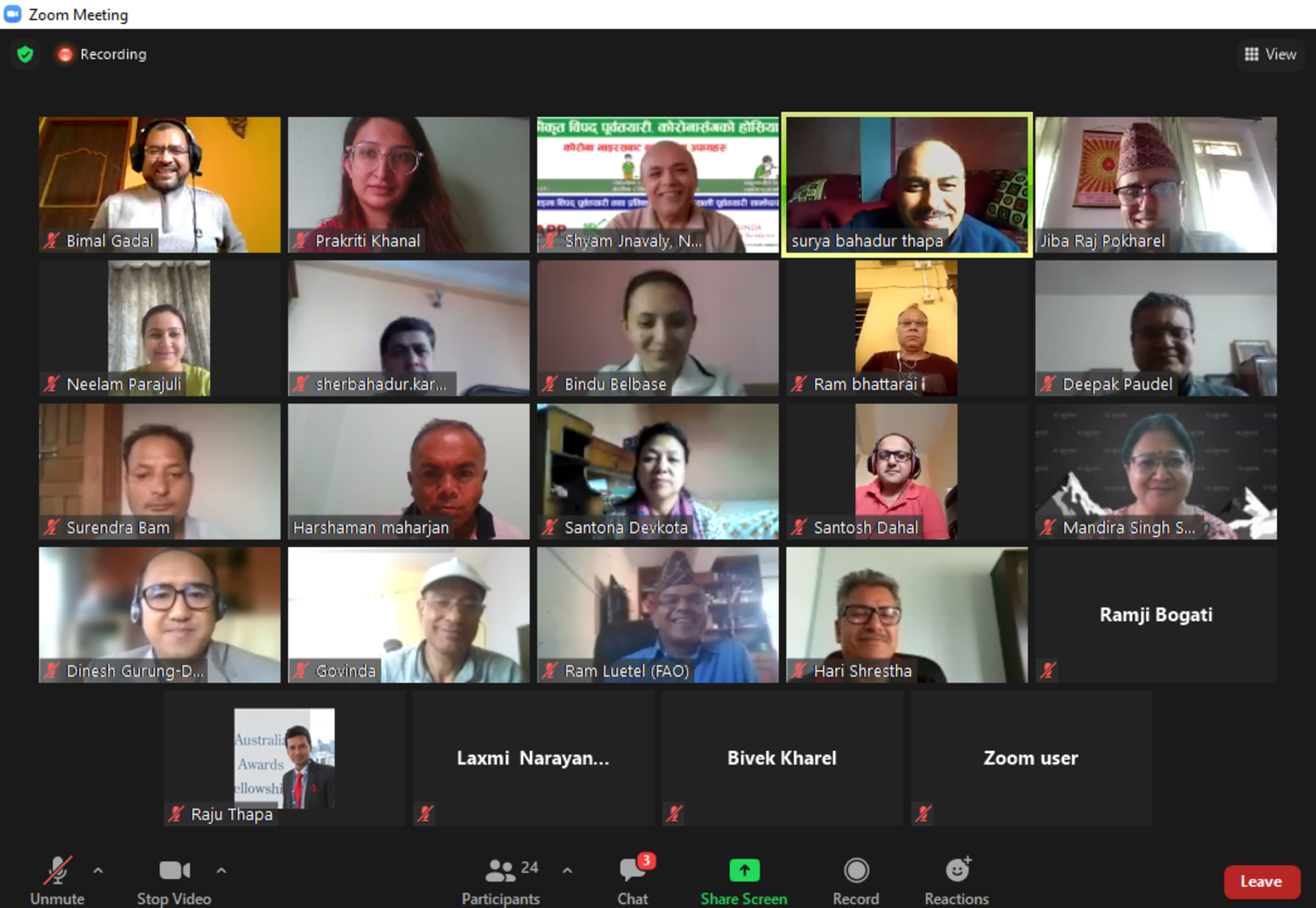 The virtual meeting with Disaster Preparedness Network- Nepal (DPNet) Board Member, Advisory Committee and Technical Advisors and Capacity Building Project team was held on 6th may 2021 with the objective to share project agreement signed between DPNet and USAID/Tayar. Altogether 27 participants joined the event. The program was initiated with welcoming notes from Chairmanship Mr. Surya Bahadur Thapa. Dr. Raju Thapa, General Secretary of DPNet initiated the meeting welcoming all the members inviting Chairperson to highlight on the objectives of program. He emphasized on the need of discussion and to clarify the roles and responsibilities of DPNet for the project as well as in a situation of COVID-19 pandemic. New project team introduces themselves and there was a short interaction between participants and new project team.