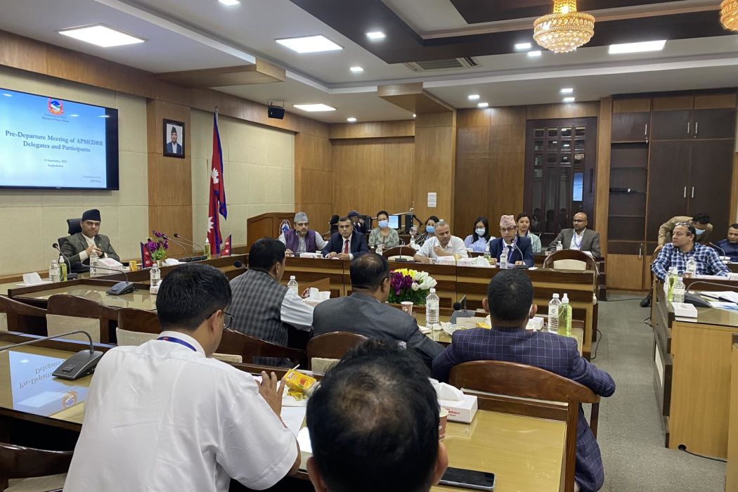 Pre-departure Meeting to participate in APMCDRR event was organized on 12th September, 2022. The meeting was chaired by the Secretary of Ministry of Home Affairs, Mr. Tek Narayan Pandey and facilitated by Chairperson of the DPNet Mr. Surya Bahadur Thapa. Around 50 prospective prospective participants of APMCDRR attended the program.
