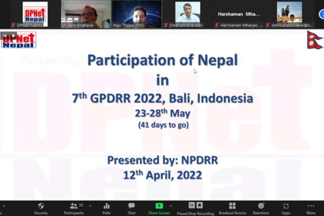 DPNet in collaboration with NDRRMA organized a GPDRR 2022 preparatory meeting virtually on 12th April, 2022. The program was chaired by Dr. Raju Thapa, Acting Chair of DPNet. Altogether, 50 participants joined the preparatory meeting.