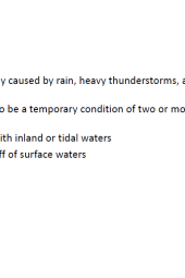 A flood is typically triggered by various natural phenomena such as intense rainfall, heavy thunderstorms, and the melting of snow, leading to an overflow of water beyond the capacity of normal drainage systems. This natural disaster results in the temporary inundation of large expanses, typically two or more acres, of previously dry land. Floods can be triggered by the overflow of inland or tidal waters, as well as the rapid runoff of surface waters. Additionally, mudflows, characterized by the movement of water-saturated earth and debris, contribute to the destructive impact of floods. The consequences of floods include widespread damage to property, displacement of populations, and disruption of communities, underscoring the importance of effective disaster preparedness and management strategies to mitigate the impact of these events.
