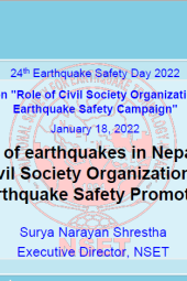 The presentation addresses the scenario of earthquakes in Nepal and highlights the role of Civil Society Organizations (CSOs) in promoting earthquake safety. Surya Narayan Shrestha from NSET leads the discussion, exploring vulnerabilities, risks, sources of earthquake risk, the Disaster Risk Reduction approach, the importance of raising awareness and building capacity, and procedures for supporting disaster preparedness and planning. The presentation also emphasizes the crucial role of CSOs and introduces the concept of an innovative funding mechanism.