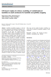 This paper applied weights-of-evidence modeling in a GIS to create landslide susceptibility maps for two small catchments in Shikoku, Japan, each with an area of less than 4 sq km. Thematic maps were generated based on various factors related to landslide activity, such as slope, aspect, relief, flow accumulation, soil depth, soil type, land use, and distance to roads. The study found that weights-of-evidence modeling was a useful approach for landslide susceptibility mapping in small catchments with homogeneous geology. Accuracy was assessed through success rates.