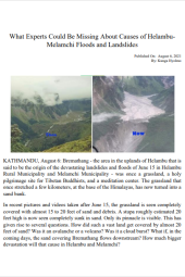The article discusses potential oversights by experts regarding the causes of floods and landslides in the Helambu-Melamchi region. It suggests that experts might not be considering certain crucial factors contributing to these natural disasters. The article highlights the need for a more comprehensive understanding of the environmental, geographical, and climatic conditions in the area to develop effective mitigation and response strategies for such events.