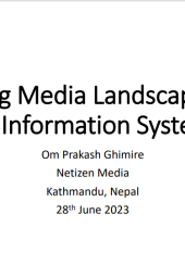 The presentation on Scoping Media Landscape: DRR and Information Systems was prepared and shared by Mr. Om Prakash Ghimire, Netizen Media during the Second National Conference on Disaster Risk Reduction (NCDRR) organized by MoHA in partnership with USAID Tayar Nepal and DPNet Nepal. This particular presentation talks about disaster through the media lens, how media can be incorporated in spreading knowledge on disaster, how access, use, and trust of media in disaster can help in minimizing the disaster risk, the gaps till now and the way forward from the learnings till date.