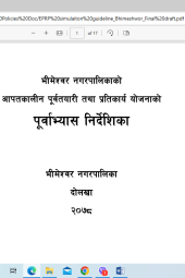 The high vulnerability and limited capacity of the Bhimeshwor Municipality area make it prone to frequent emergencies, leading to the creation of crisis situations. To cope with the potential occurrence of emergencies in the municipality and to ensure comprehensive preparedness and response to post-disaster emergencies, this preparedness and response plan has been published. This response plan guides the responders and concerned individuals on how to react and respond during disasters and crisis situations. This simulation guideline provides a framework on how to simulate and train the community people as preparedness for crisis situations.