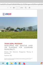 This document is based on DRRM planning and intervention of Godawari Municipality 2022. The major objectives of this document are to enhance the disaster management and response capacity of the municipality, to institutionalize Disaster Risk Reduction and Management (DRRM) into the local level development planning and programs of both the municipality and its wards; to build, improve, and strengthen institutional and community-based disaster preparedness and response mechanisms.