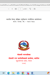 This document is the Local Disaster Risk Reduction Strategic Action Plan of Godawari Municipality for the period from 2078/79 to 087/088. It encompasses various subjects including background information, relevant laws, and policies pertaining to disaster risk reduction. The plan outlines the local strategy action plan for disaster risk reduction, highlighting priority actions in different areas such as investment management and increasing resilience, disaster preparedness, and financial arrangements for implementation. It also addresses aspects related to monitoring, evaluation, and review of the strategic plan.