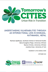 The document is part of the Tomorrow's Cities research and the UKRI GCRF Urban Disaster Risk Hub, focusing on cross-city social sciences inquiry about vulnerabilities and capacities. The document contains the analysis of the case study of Ward No. 21 in Khokana, Nepal, to understand the cultural, social, and political roots of vulnerability among individuals and different social groups. Nepal faces high climate and earthquake risks, making it one of the most vulnerable countries globally. The study emphasizes the shift from studying disasters as natural phenomena to recognizing them as social and political, leading to the concept of social vulnerability. Nepal's new Constitution and recent legislation and policies address gender equity and social inclusion (GESI) in disaster situations, aiming to include marginalized groups in policies and programs.