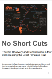 The study assesses the impact of the earthquake on the adventure tourism sector in Dhading, Gorkha, Nuwakot, and Sindhupalchowk districts, with a focus on defining relief and recovery strategies for restoring livelihoods, the economy, and services while ensuring resilient recovery. The objectives included evaluating damage to tourism services, accommodation, and cultural monuments, identifying priority needs for affected entrepreneurs, assessing food security measures during recovery, and identifying potential areas for livelihood development in post-disaster contexts. The scoping exercise resulted in concrete support measures, including an assessment of damage, socio-economic impacts, and a long-term recovery strategy. The study identified key stakeholders, beneficiaries, and formulated intervention plans to enhance local livelihoods and recovery initiatives, culminating in a dissemination workshop in Kathmandu for presenting and discussing the initial report with action plans and implementation modalities.