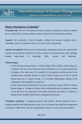 The document "Disaster Management Terminologies" published by the National Institute of Disaster Management, Ministry of Home Affairs, Government of India, serves as a comprehensive reference for key concepts in disaster management. It provides clear definitions and explanations of terminologies essential for understanding and implementing effective disaster response strategies. The terminologies cover various aspects, including risk reduction, preparedness, response, recovery, and resilience. Aimed at practitioners, policymakers, and the public, the document contributes to a common understanding of disaster management language, fostering improved communication and coordination in the field. It is a valuable resource for those involved in disaster management efforts in India.