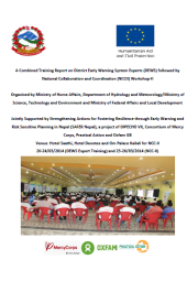 The Department of Hydrology and Meteorology (DHM), along with the Ministry of Home Affairs (MoHA) and Ministry of Federal Affairs and Local Development (MoFALD), organized two workshops in Dhangadhi, Nepal. The District Early Warning System (DEWS) Expert Training took place from 20th to 24th March 2014, aimed at capacity building and replication of Community-Based Early Warning Systems (CBEWS) in four districts. The National Collaboration and Coordination (NCC II) Workshop occurred on 25th and 26th March 2014, focusing on challenges and coping strategies for implementing CBEWS, sharing funding information, and designing a national simulation exercise.