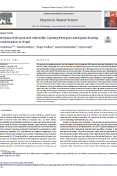 The paper is about the inclusion of the poor and vulnerable learning from post-earthquake house reconstruction in Nepal. This paper entails: The most vulnerable suffer greatly in disasters, facing tough recovery. Nepal's massive post-earthquake housing program aims for inclusivity. This study assesses policies and actions for social inclusion in reconstruction. It examines financial, land, design, and tech aspects, using mixed methods. Despite provisions, aid doesn't reach vulnerable households. Landless families gain ownership, a success. Future building methods should consider affordability and risk reduction. While policies help, true inclusivity requires agency and focused support. Nepal's housing recovery informs 'owner-driven reconstruction' for better inclusiveness.